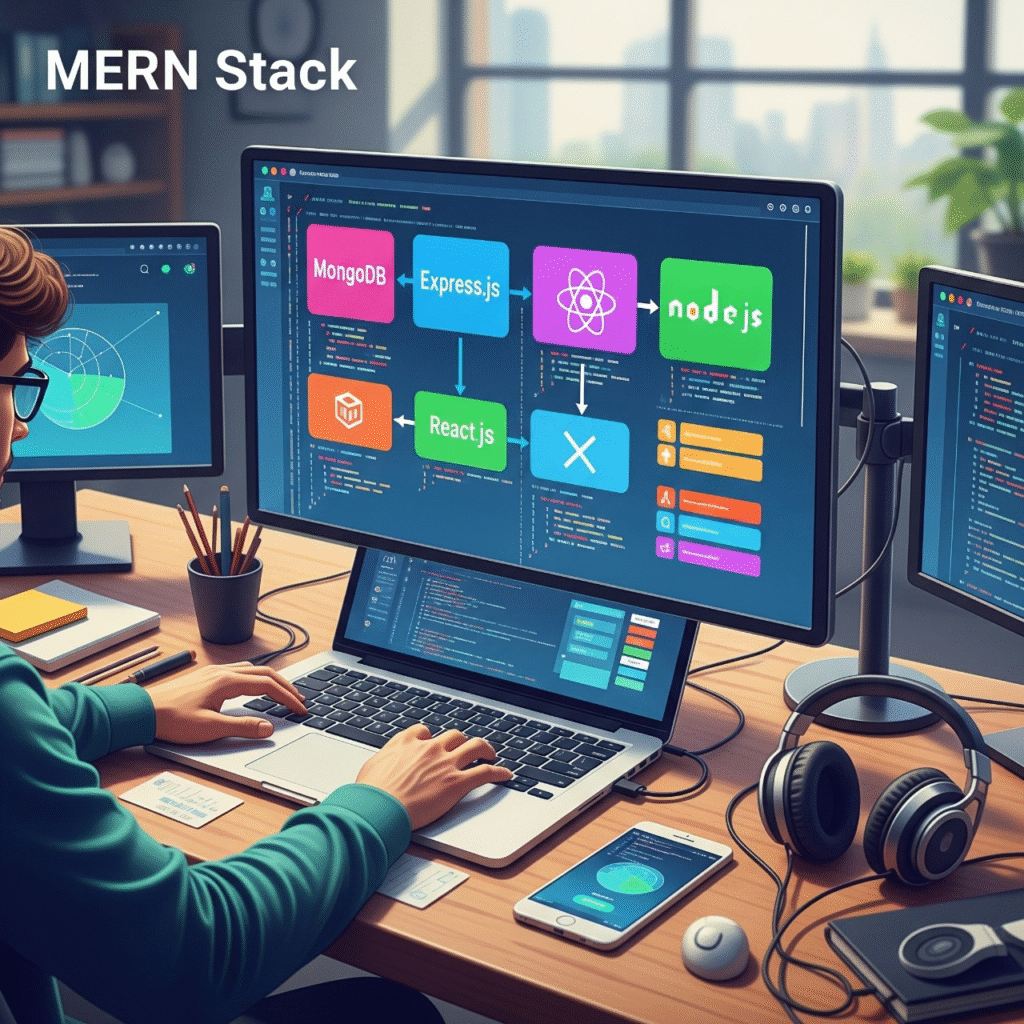 MERN stands for MongoDB, Express.js, React.js, and Node.js—a full-stack JavaScript framework that allows developers to build both frontend and backend applications using a single programming language: JavaScript. This makes it a popular choice among developers and employers alike for building scalable, dynamic web applications.